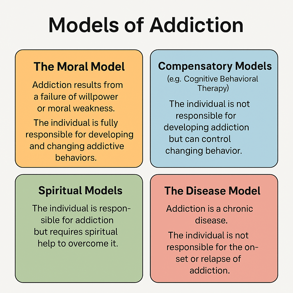 The Moral Model posits that addiction results from a failure of willpower, moral weakness, or character flaws. Within this framework, individuals are deemed fully responsible for both developing and changing their addictive behaviors (Heather, 2017). Relapse, in this context, is interpreted as a moral failing or lack of personal discipline. This model has historically underpinned punitive approaches to addiction but has largely fallen out of favor due to its stigmatizing and ineffective nature (Saitz, 2014).